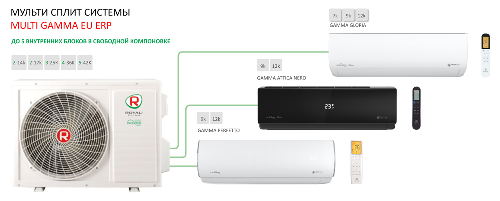 Новая современная серия мульти-сплит систем MULTI GAMMA позволяет подключить до 5 внутренних блоков серий GLORIA / ATTICA NERO / PERFETTO в свободной компоновке. Работает на новом экологичном хладагенте R32, имеет высокие показатели энергоэффективности (А/А++). Стабильная работа на охлаждение до -15 градусов, а на обогрев — до -20 градусов без дополнительных доработок.