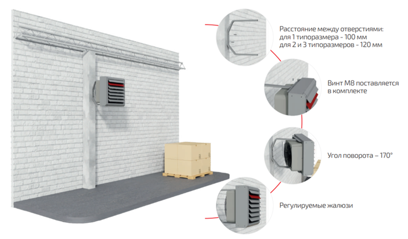 Монтировать электрические тепловентиляторы ГРЕЕРС ЕС можно только на стене в вертикальном положении. Регулировка потока воздуха осуществляется в том числе благодаря возможности вручную изменять положение жалюзи, это дает возможность плавно менять угол выхода нагнетаемого воздуха для оптимального распределения тепла.