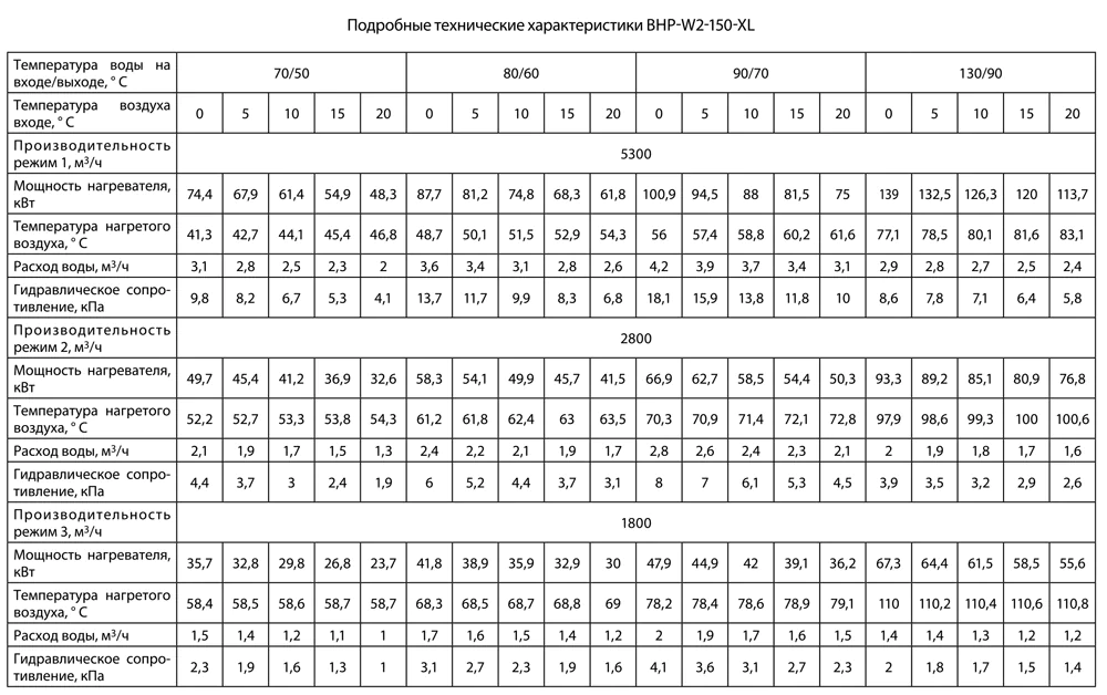 Тепловые характеристики приведены при температуре воздуха на входе +0 °С, максимальном расходе воздуха и максимальной температуре теплоносителя (указанной в таблице тепловой мощности от производителя).