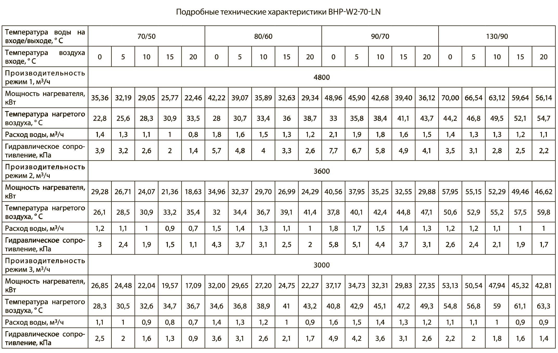 Тепловые характеристики приведены при температуре воздуха на входе +0 °С, максимальном расходе воздуха и максимальной температуре теплоносителя (указанной в таблице тепловой мощности от производителя).