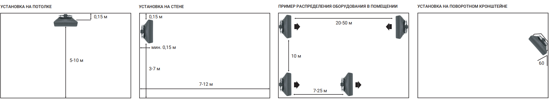 Farmer серии HCF с помощью поворотного кронштейна может быть установлен на потолке или стене, в зависимости от требуемого оптимального направления воздушного потока. Между тепловентилятором и строительными перегородками рекомендуется соблюдать следующие расстояния: