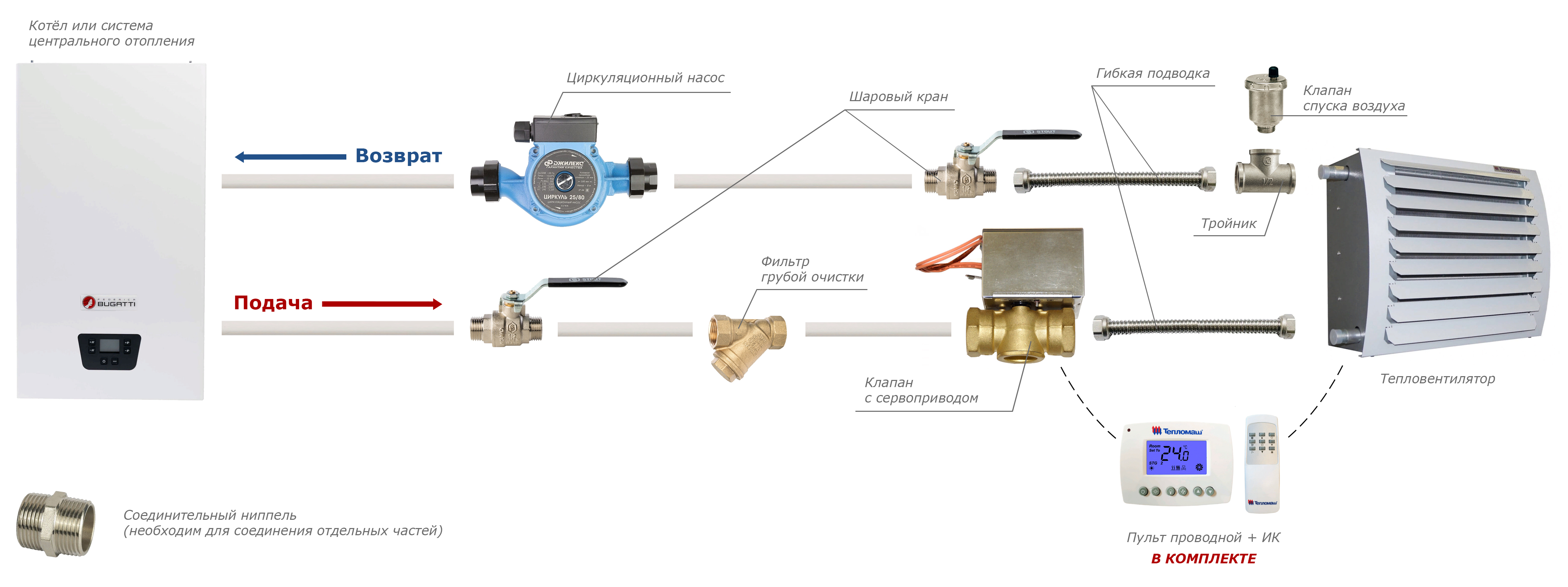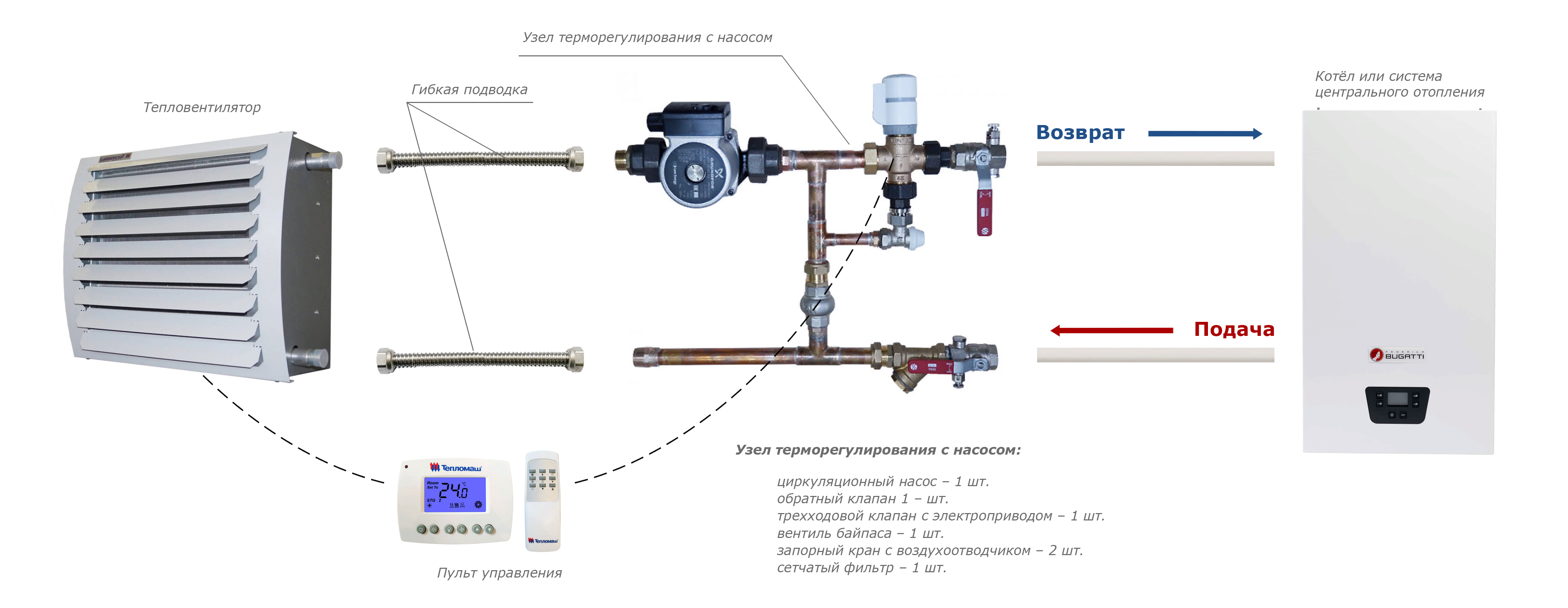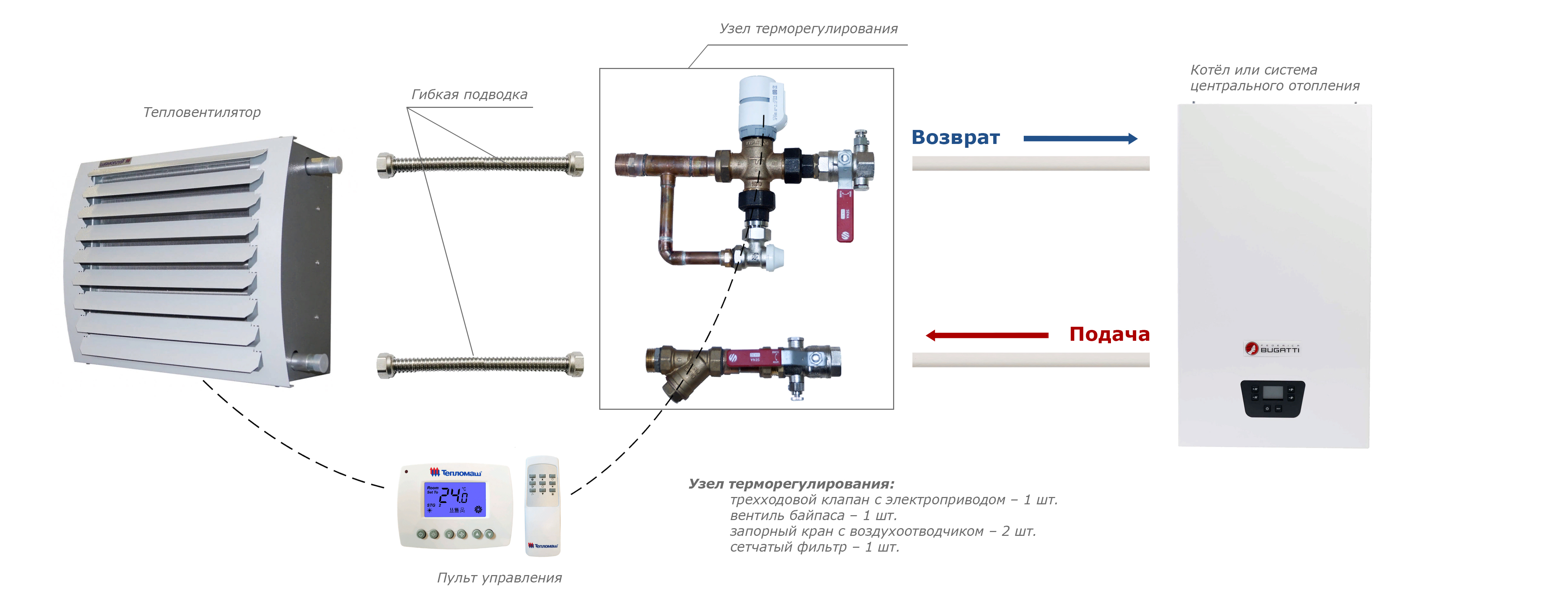 • Стандартная комплектация: тепловентилятор + проводной пульт HL10 с электронным термостатом — поддержание заданной температуры осуществляется за счет включения/выключения вентилятора и его работы на выбранной скорости. При достижении необходимого уровня температуры вентилятор отключается, теплоноситель продолжает циркулировать.