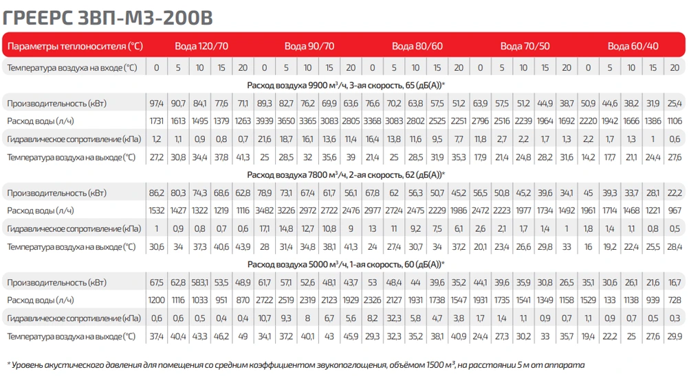 Условная тепловая мощность водяной завесы указанна в кВт.ч при температуре подаваемой воды +95°С / её охлаждением до +70°С / температура окружающей среды +15°С. При изменение любого из показателей мощность будет отличаться от заявленной. (См. технические характеристики модели)