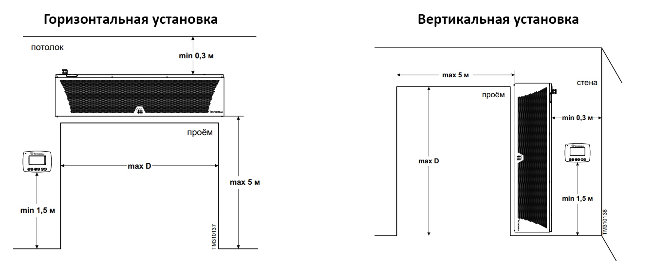 Тепловая завеса, в зависимости от проектного решения может использоваться для защиты как смесительного, так и шиберующего (отсекающего) типа — от прямого контакта с наружным воздухом через открытые двери в холодный период времени. Устанавливается внутри помещения, горизонтально над проемом или вертикально, сбоку от него, как можно ближе к краю. При большой ширине проема можно располагать сразу несколько завес вплотную друг к другу и управлять ими с одного пульта. Подходит для установки в складских помещениях, гостиницах, ресторанах, супермаркетах и др.